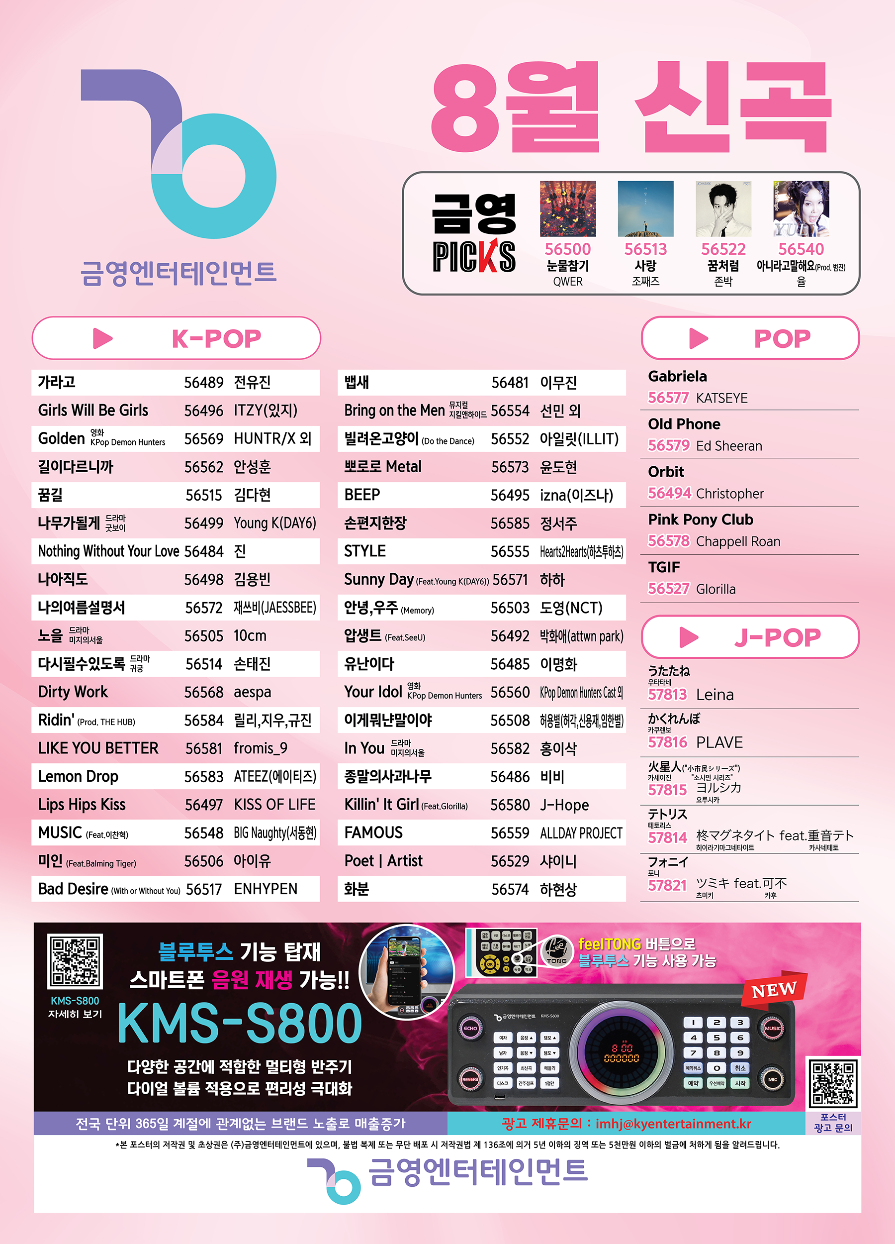 2025년8월자 금영노래방 신곡 업데이트 노래번호 찾기입니다.